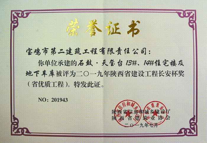 2019年陜西省建設(shè)工程長安杯獎(石鼓?天璽臺13#、14#住宅樓及地下車庫)